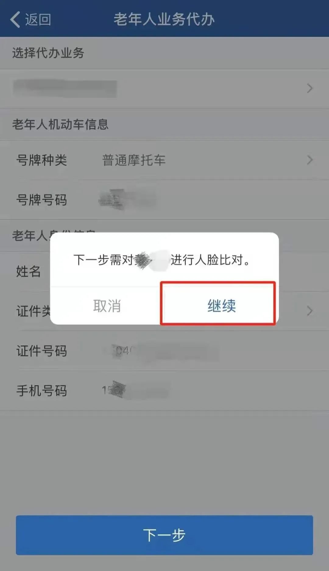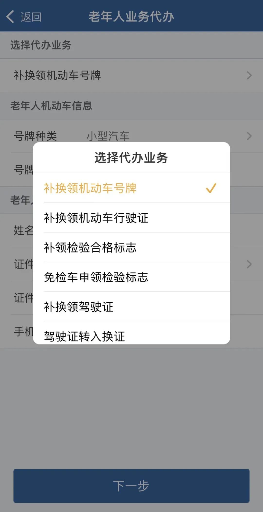 选择办理业务项,填写老年人机动车信息和老年人身份信息